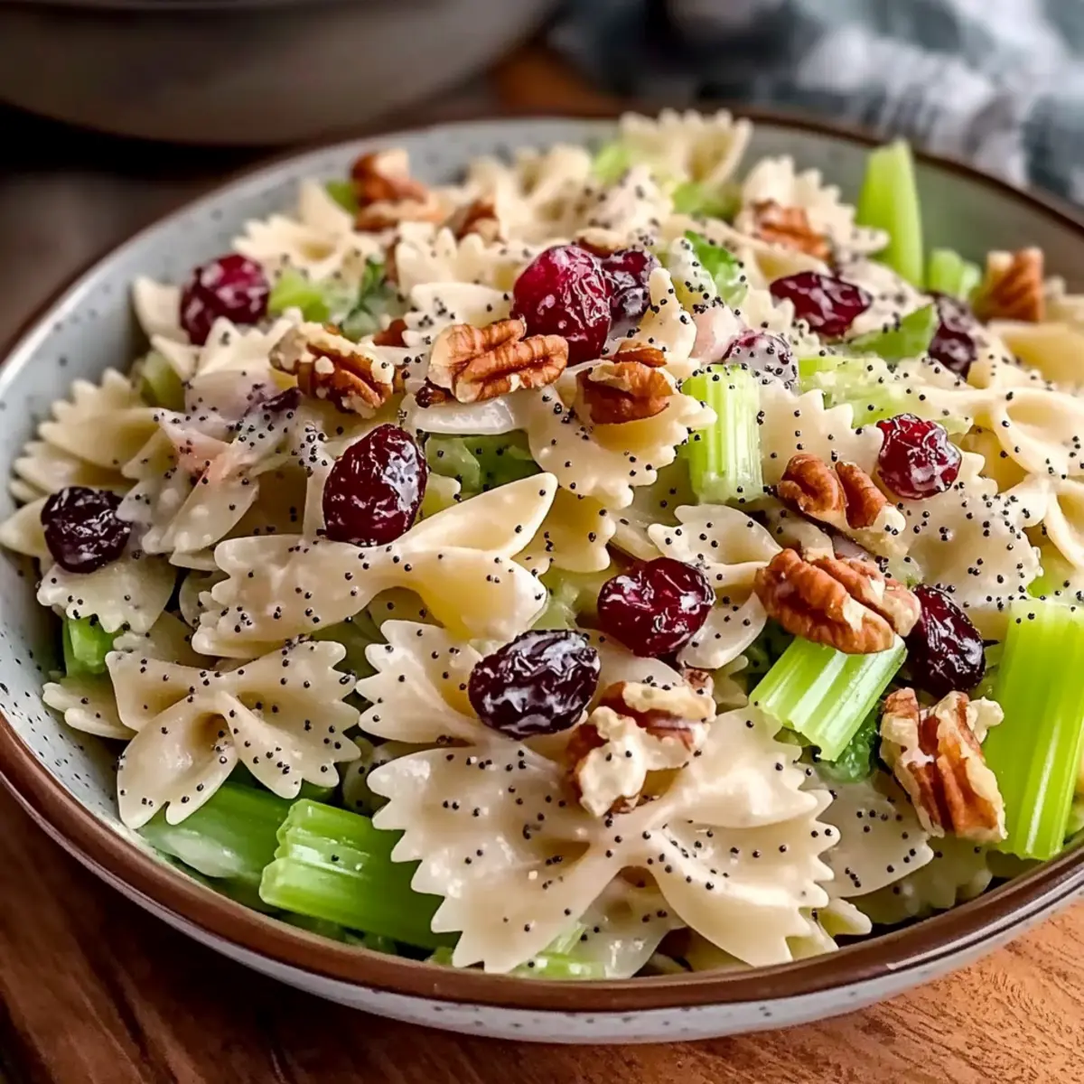 Very! If you find your Bow-Tie Cranberry Pasta Salad has become a bit dry, simply add a couple of tablespoons of poppy seed dressing or another light vinaigrette and toss to incorporate. This will bring back that creamy, vibrant vibe!