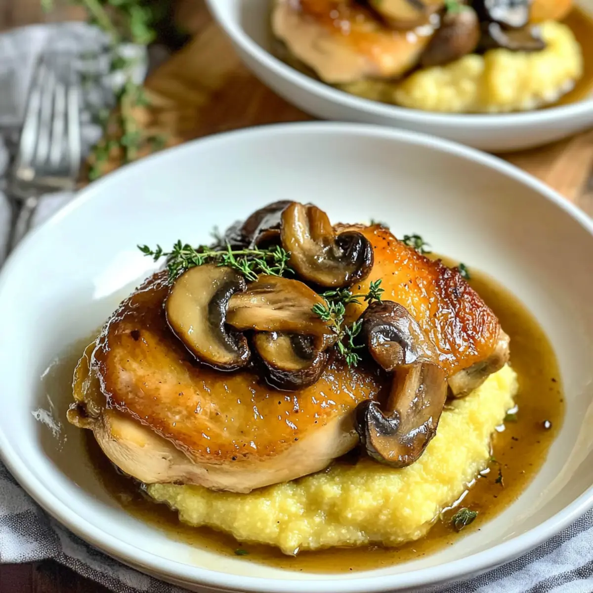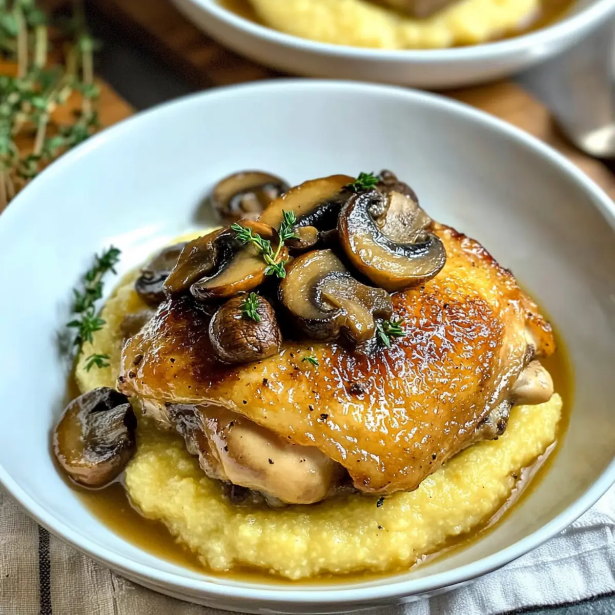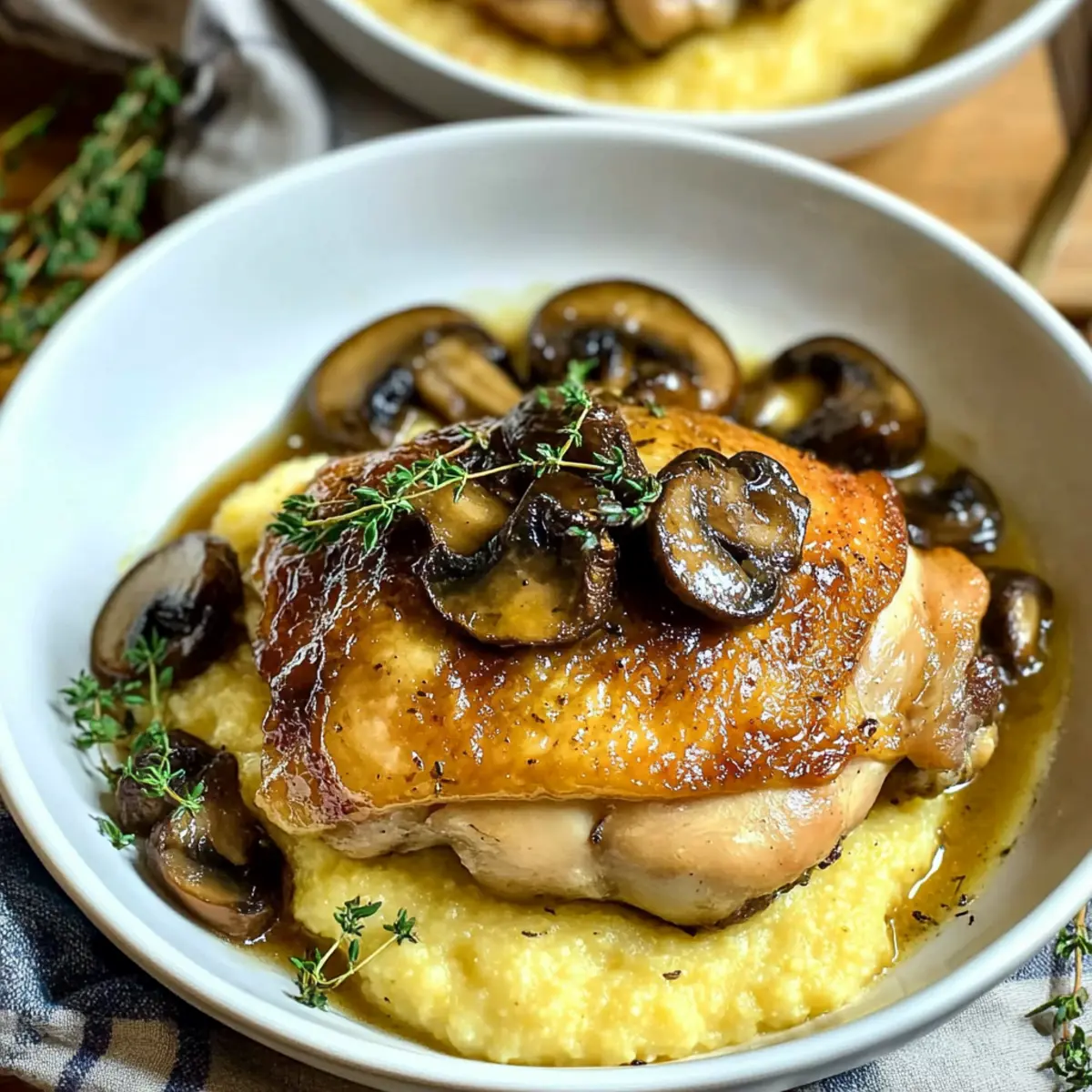 - To serve, spoon your creamy polenta into bowls, creating a cozy base for the dish. Top the polenta generously with the braised chicken thighs and their savory mushroom sauce, making sure to spoon some of the delightful sauce over everything. Enjoy the warmth and comfort of this hearty dish, perfect for gathering your loved ones around the table.
