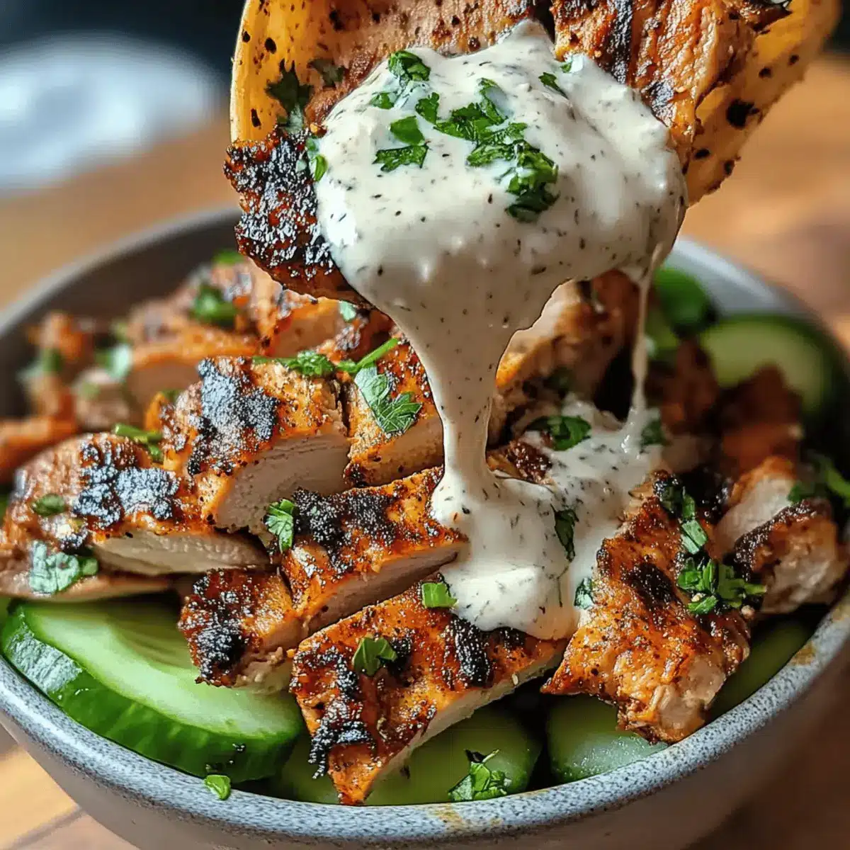 - Once the chicken is cooked, let it rest, slice it, and serve in pita bread or on its own, drizzled with garlic sauce.
