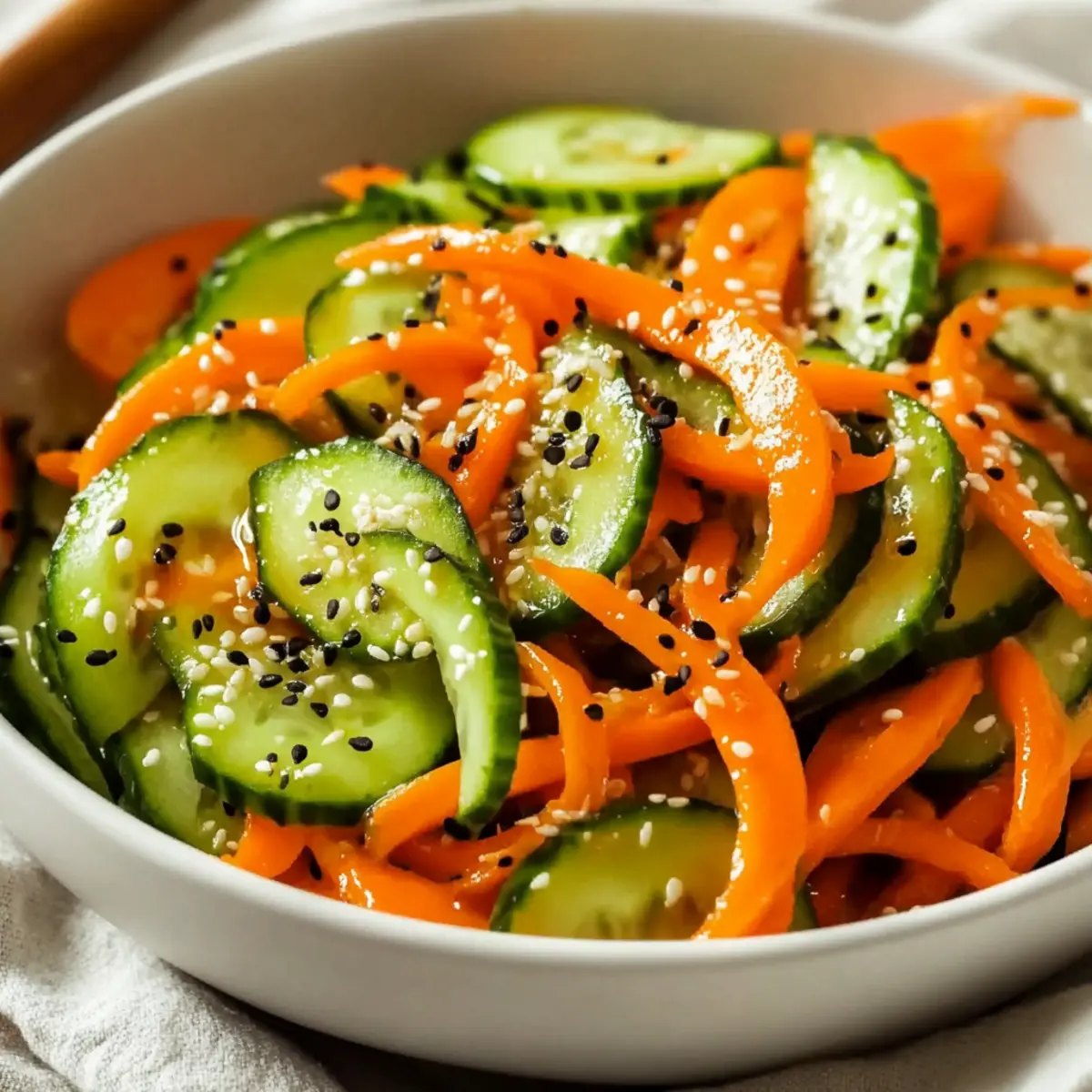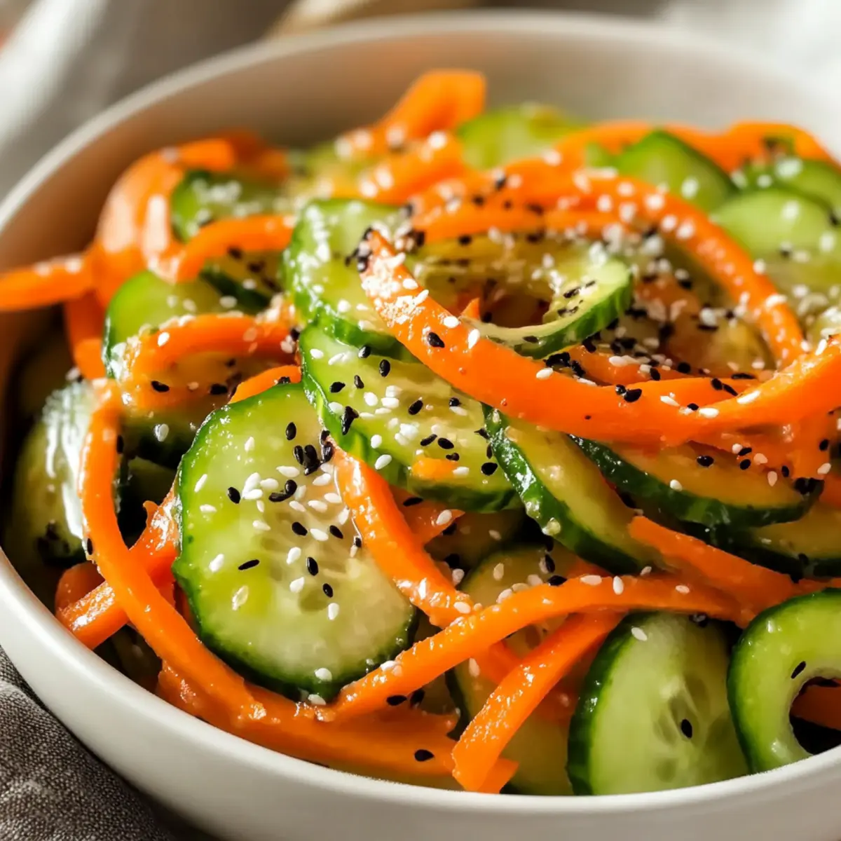 Enjoy your Cucumber Carrot Salad immediately for the freshest crunch. Alternatively, let the salad rest for 5 to 10 minutes to allow the flavors to meld together, enhancing the overall taste. For an added touch, consider garnishing with sesame seeds or chopped green onions. This bright and refreshing dish is perfect as a light lunch, or as a side at your next gathering!