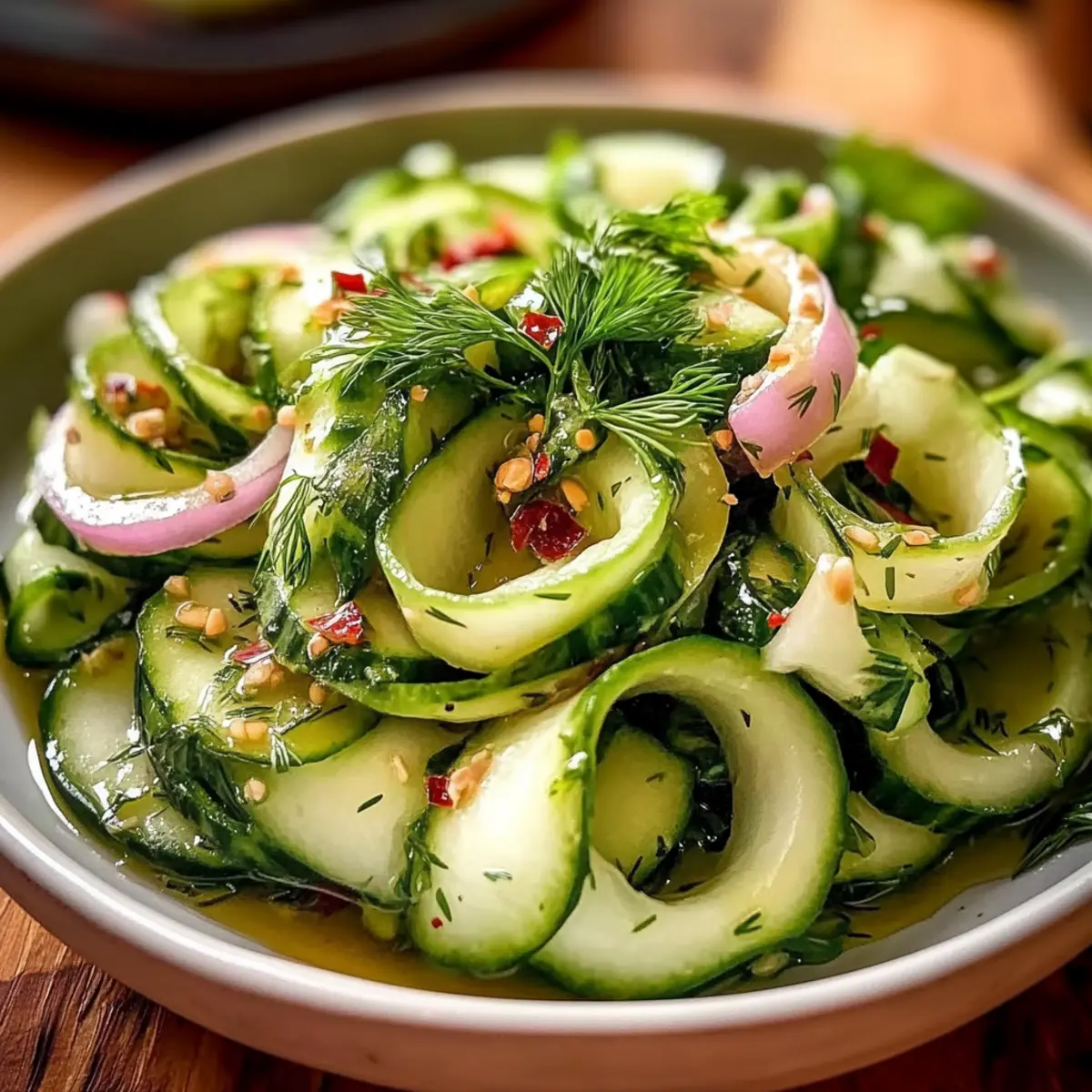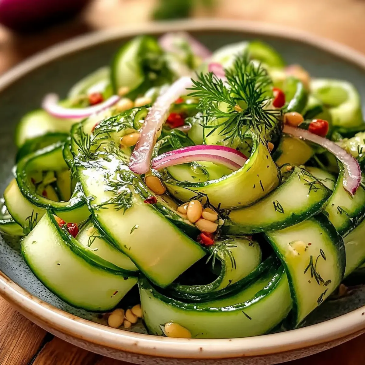Transfer the salad into a vibrant serving bowl, showcasing those lovely cucumber ribbons. Just before serving, sprinkle freshly chopped dill over the top for an aromatic garnish. This final touch adds not only a burst of flavor but also a pop of color to your Cucumber Ribbon Salad, making it visually appealing for any gathering.