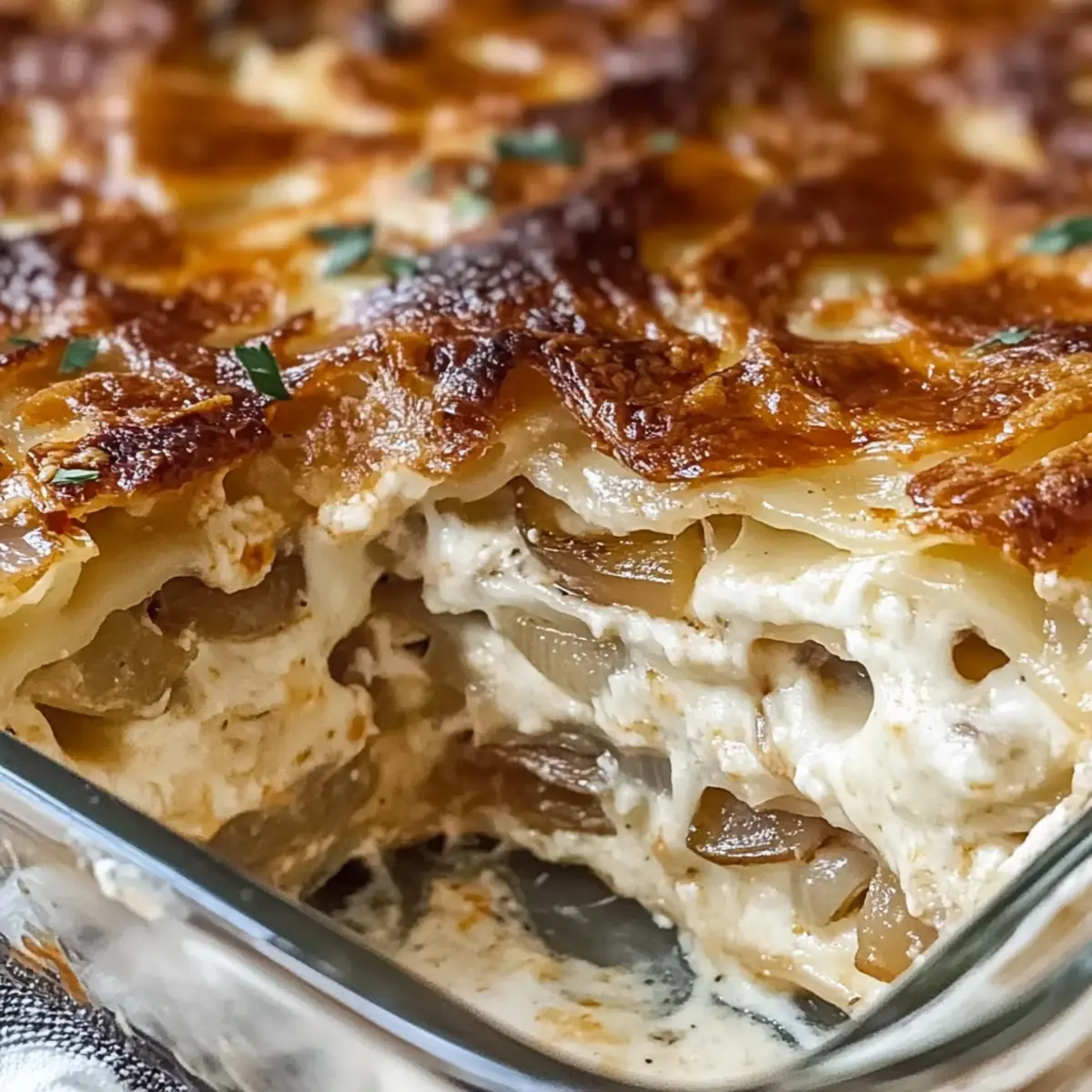 Savory French Onion Lasagna with Crispy Croutons Delight