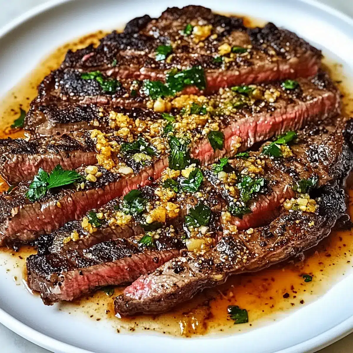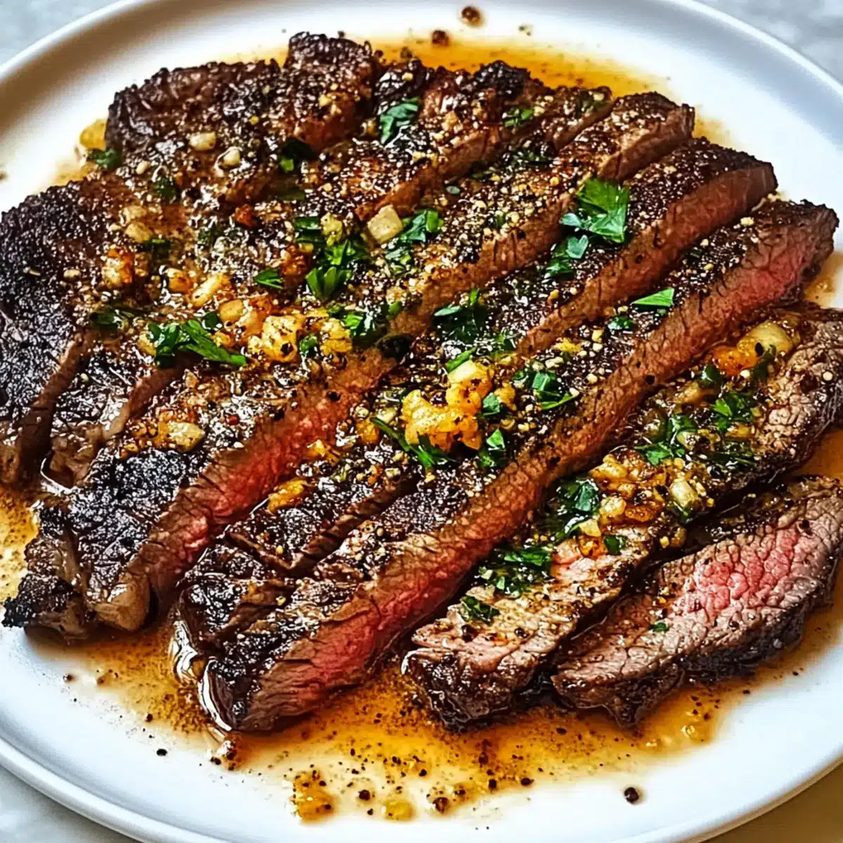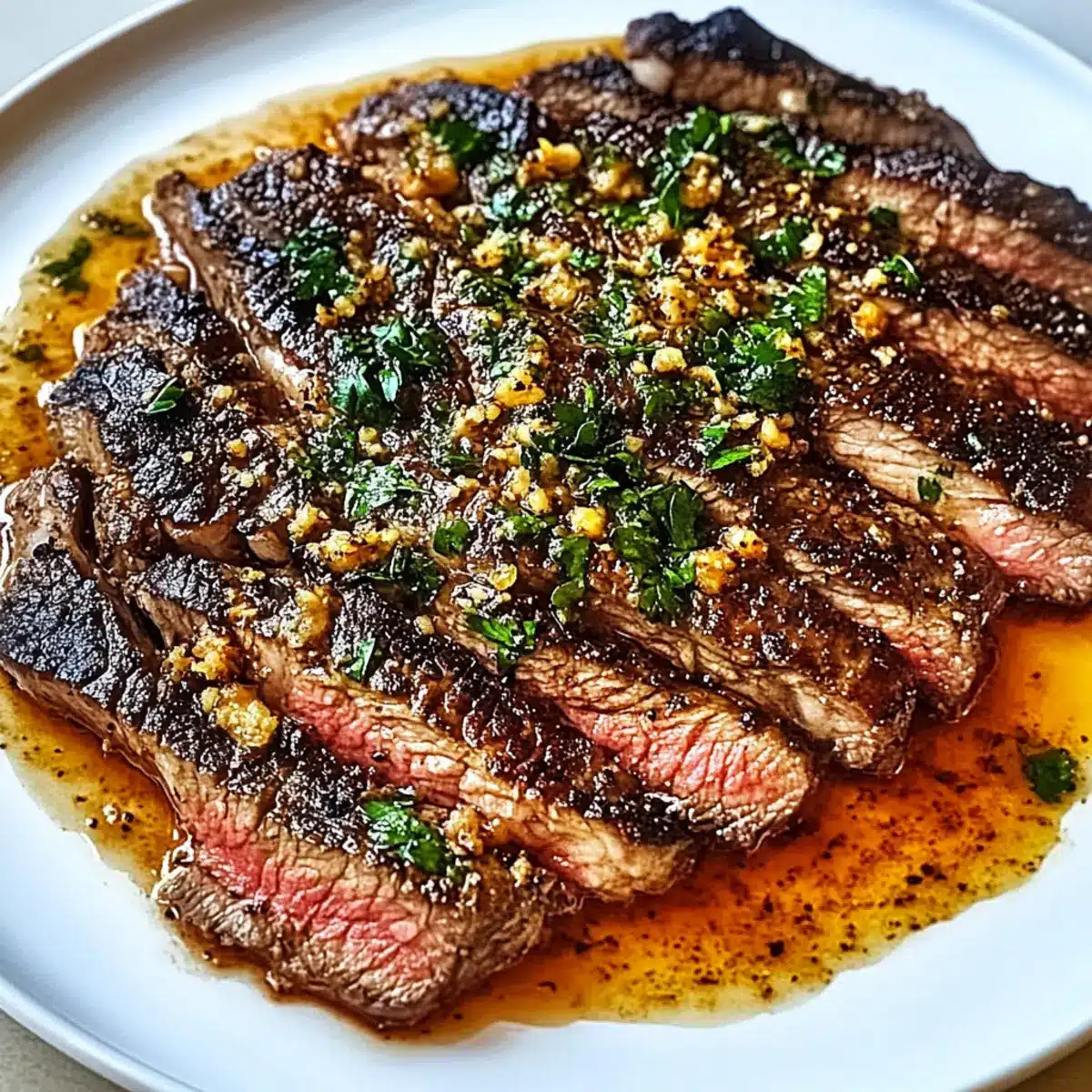 - After resting, slice steak against the grain into thin strips. Arrange slices on a platter, drizzle with garlic butter, and garnish with parsley.