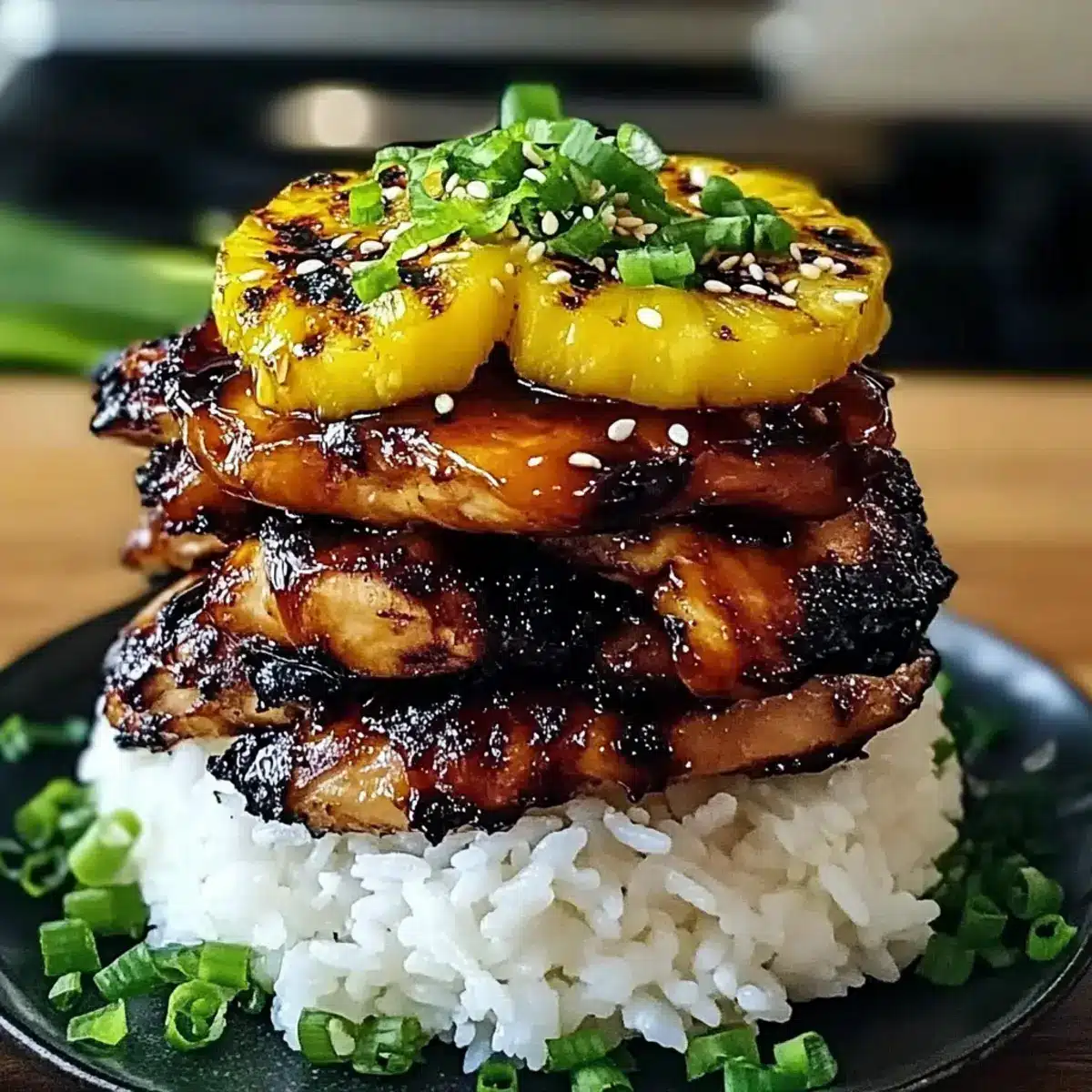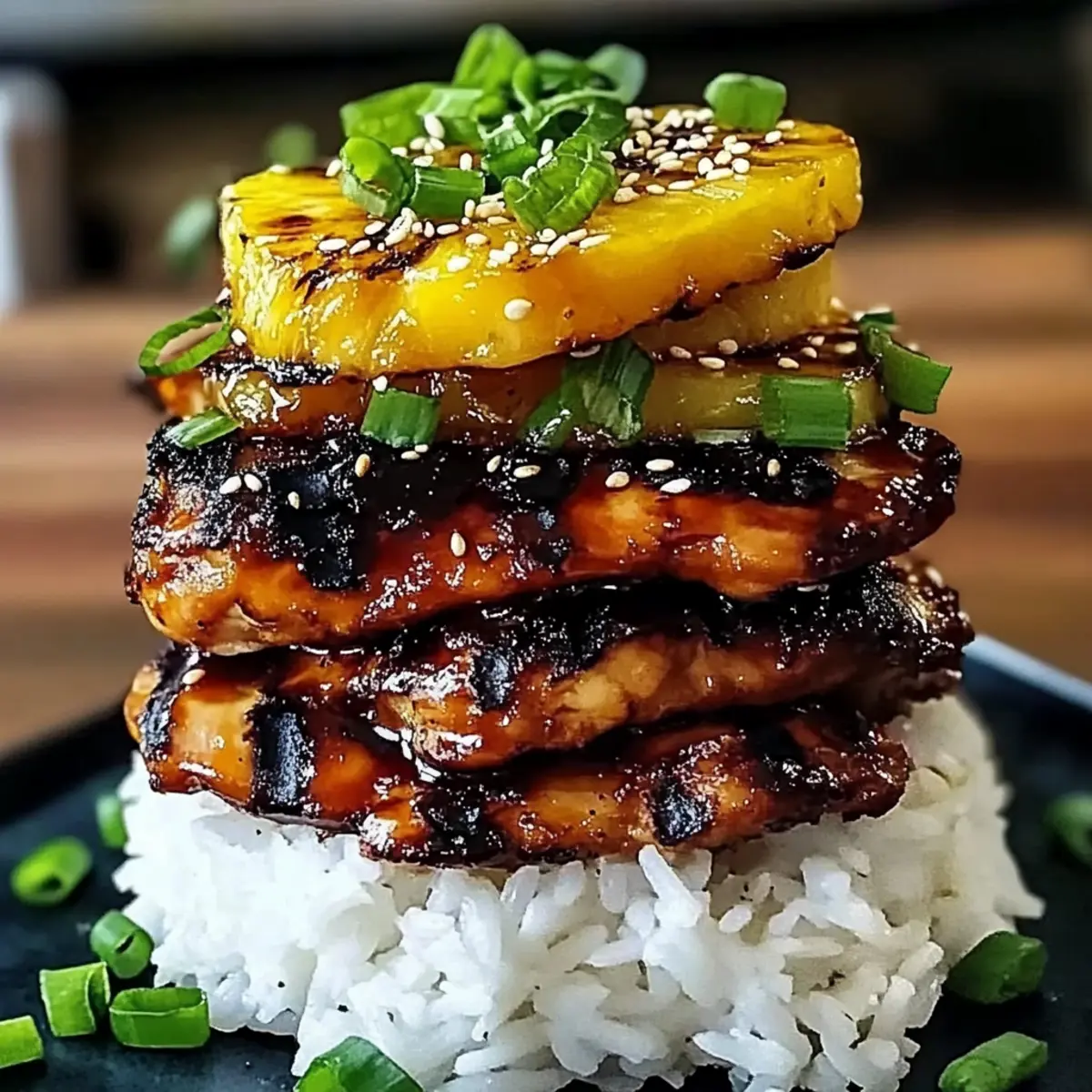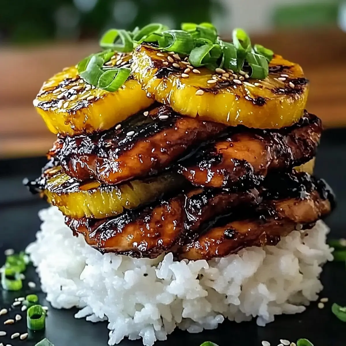 - Assemble the Stack: Start with a layer of cooked white rice, place a piece of grilled chicken on top, add a grilled pineapple ring, drizzle with glaze, and garnish with green onions and sesame seeds.