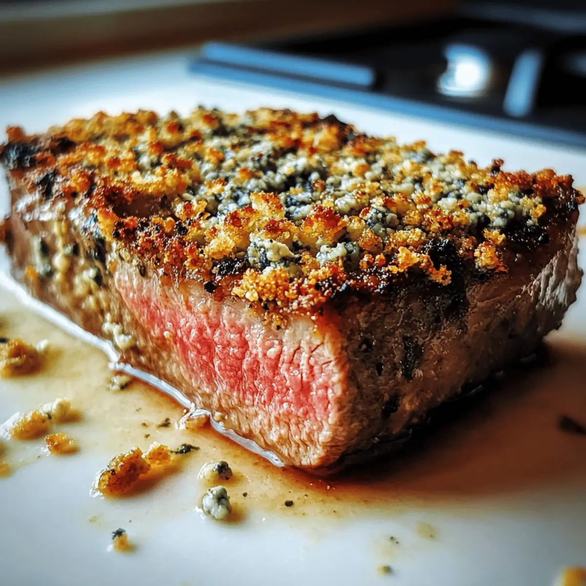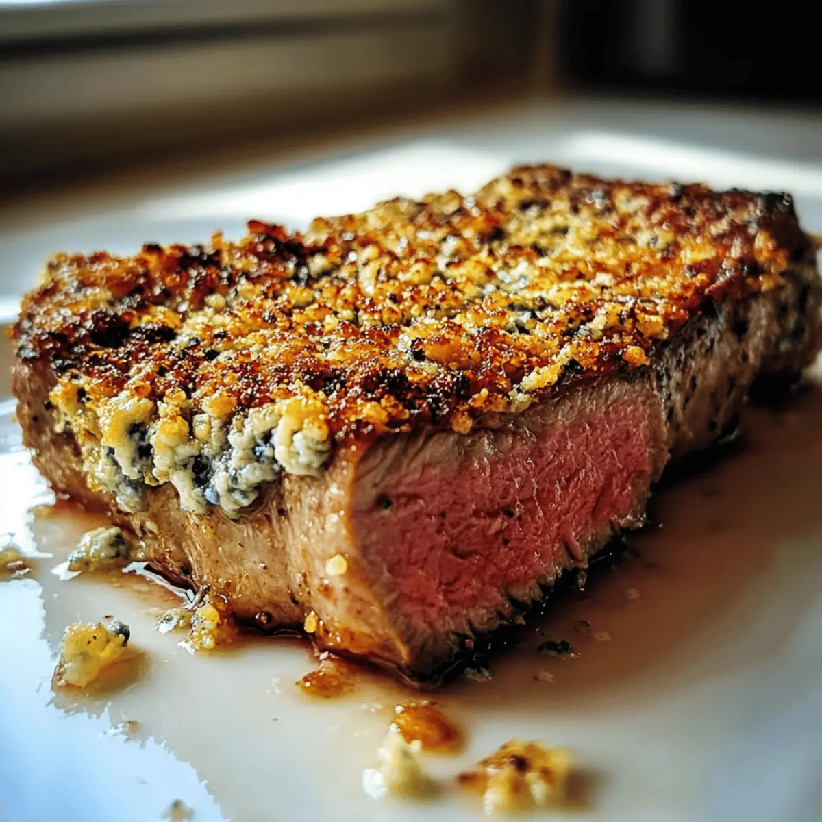 Firm Pressing: When applying the blue cheese crust, press the mixture firmly onto the steak—this prevents it from sliding off during baking, leading to a cohesive bite.