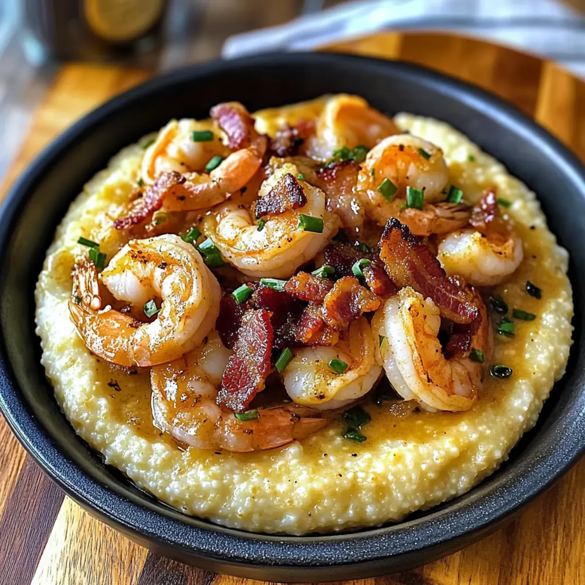 - Spoon creamy grits into bowls, top with shrimp mixture and crispy bacon, then garnish with green onions.