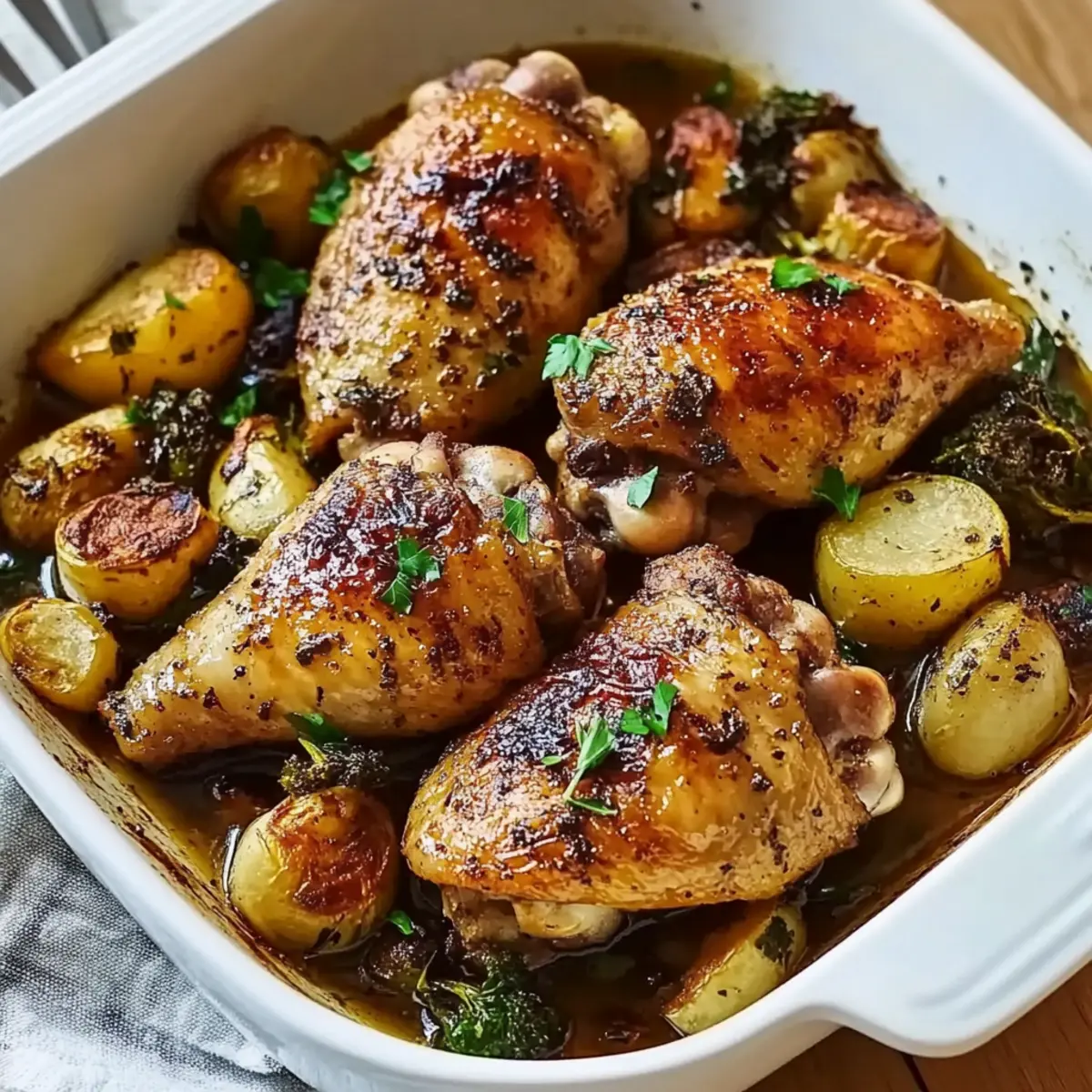 About halfway through baking, carefully remove the dish from the oven and baste the chicken thighs with the pan glaze. This helps to keep the chicken moist and boosts the flavor even further. Return the dish to the oven and continue baking until fully cooked.