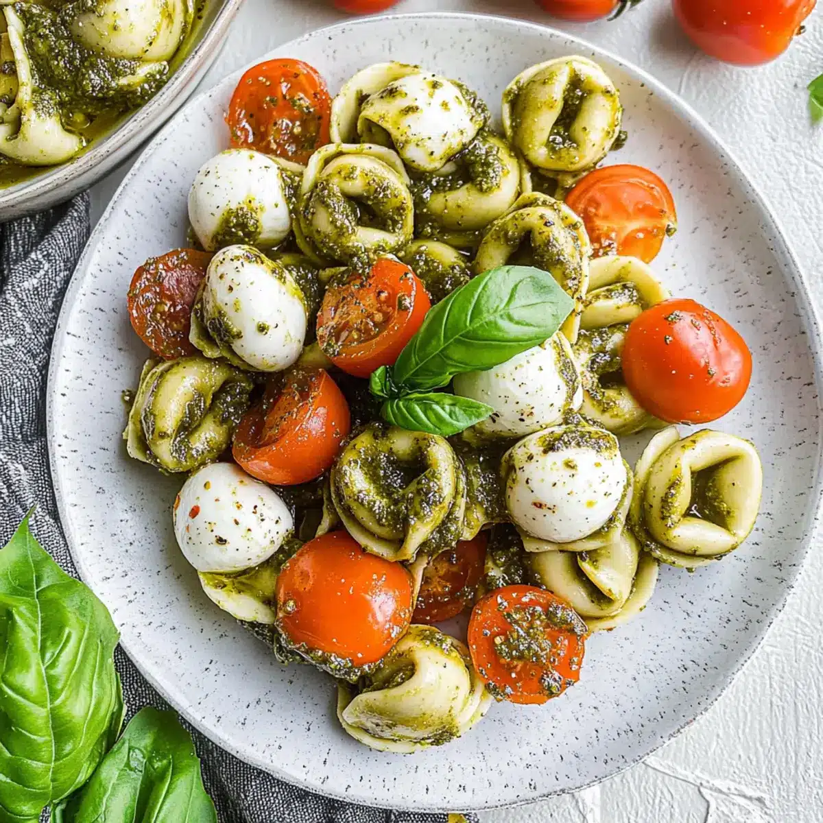 - In a mixing bowl, add the chilled tortellini. Drizzle the basil pesto over the pasta and toss to coat. Add fresh mozzarella, halved tomatoes, chopped basil, and red onion, stirring gently.