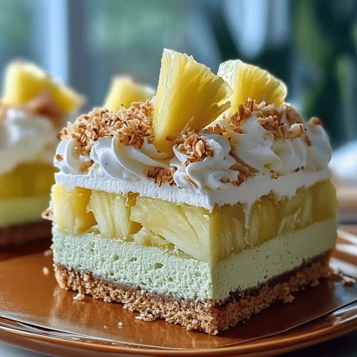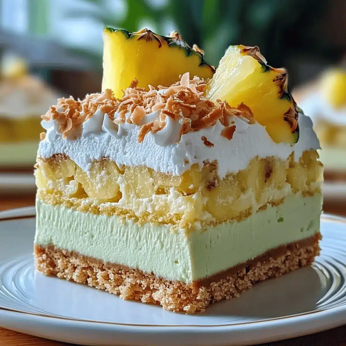 - Carefully remove the sides of the springform pan. Top with whipped cream swirls, toasted coconut flakes, and fresh pineapple wedges. Slice with a warm knife and serve chilled.