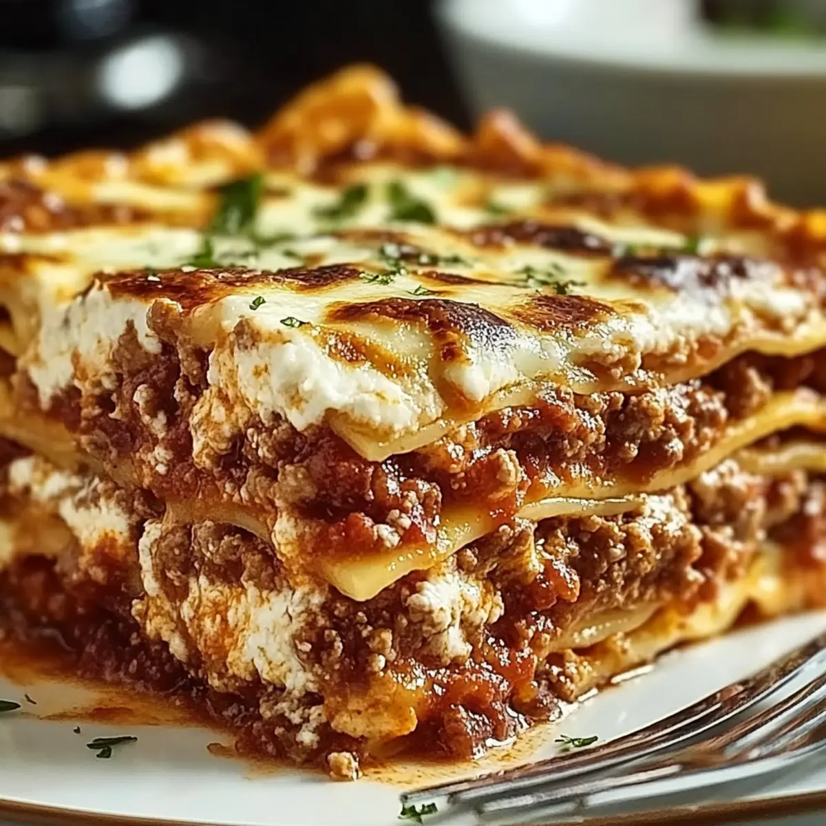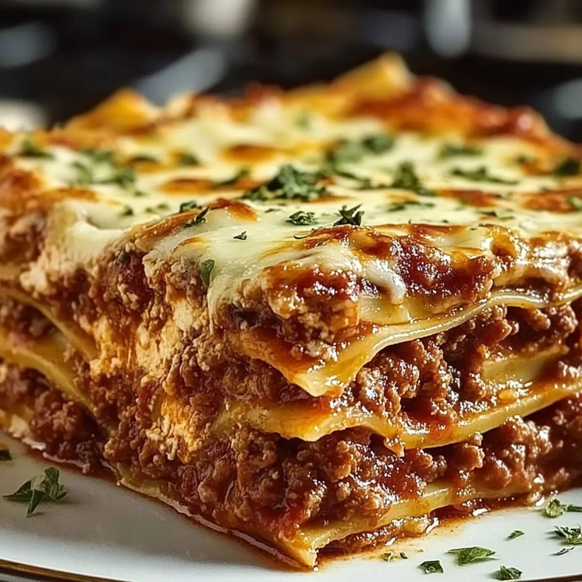 - Let the lasagna rest for 10–15 minutes before serving. Optionally, garnish with parsley.