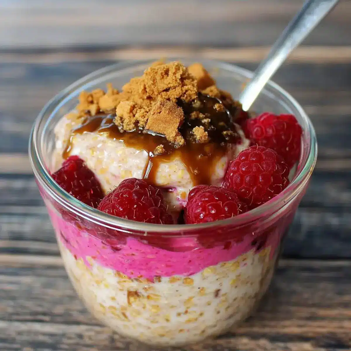 After assembling the layers, return the jar or bowl to the fridge for about 15-30 minutes. This short chilling time allows the Biscoff topping to slightly set up while keeping everything cool and refreshing. Serve your Raspberry & Biscoff Overnight Oats directly from the fridge or, if preferred, let them sit at room temperature for a softer texture before enjoying.