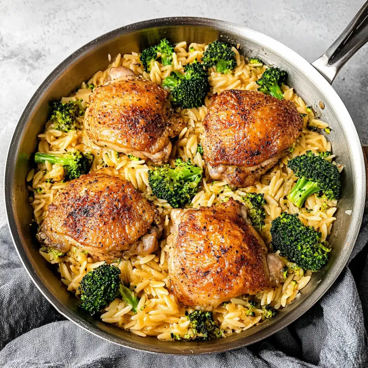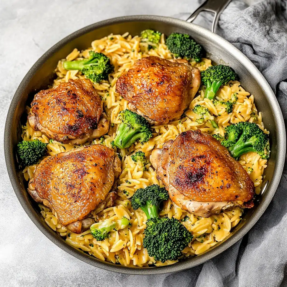 Skillet Chicken Thighs with Broccoli Cheddar Orzo Bliss